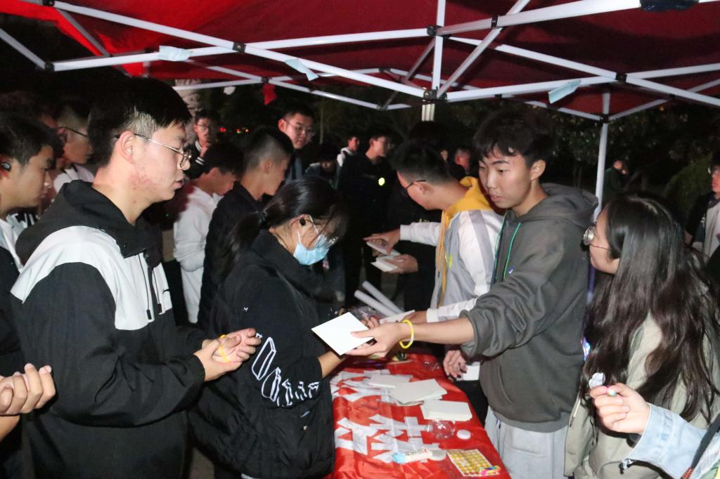 领跑人整理队伍,夜跑正式开始。本次活动从泰山广场出发,向东经过S1实验楼,整体呈环形路线,最终返回泰山广场,全长共计3公里。为了确保同学们夜跑途中的安全,领跑人用鲜明的标志物引领同学前进。在夜跑途中设有两个打卡点,同学们可以在打卡处盖章纪念并稍作休息调整。八点十分,跑步队伍回到泰山广场,夜跑活动也接近尾声。同学们在签到处有序领取交换物品并合影留念、有序签退,本次活动圆满结束。