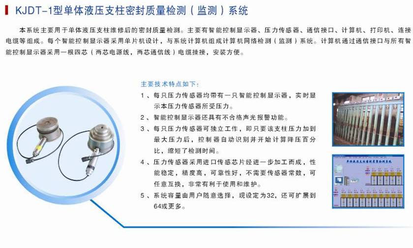 本系统主要用于单体液压支柱维修后的密封质量检测。主要有智能控制显示器、压力传感器、通信接口、计算机、打印机、连接电缆等组成。每个智能控制显示器采用单片机设计,与系统计算机组成计算机网络检测(监测)系统。计算机通过通信接口与所有智能控制显示器采用一根四芯(两芯电源线,两芯通信线)电缆挂接,安装方便。