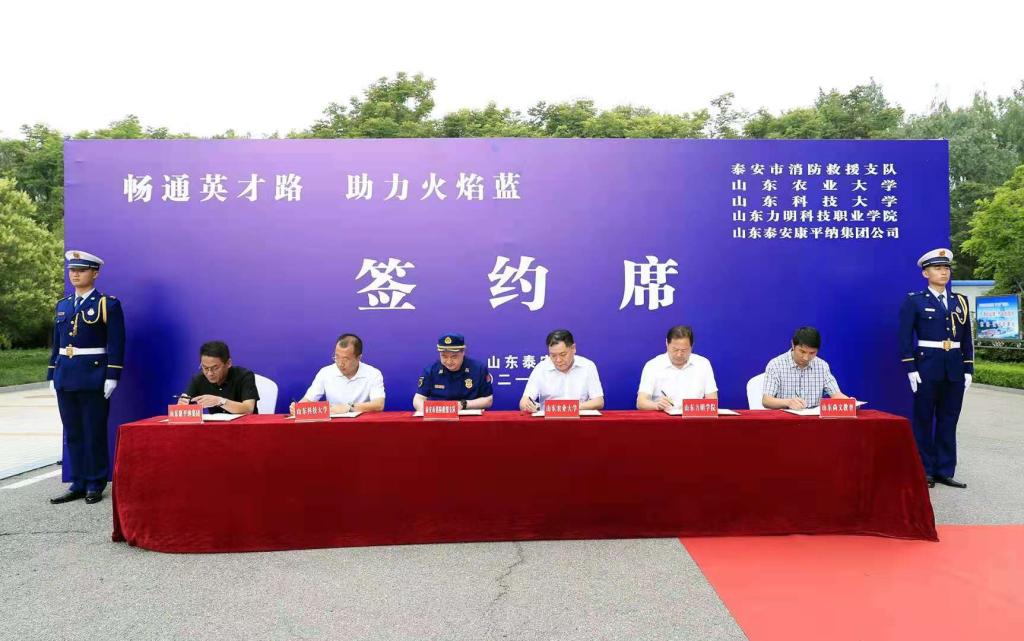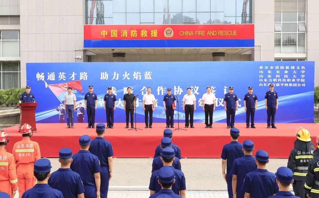 为进一步深化校地校企合作,充分发挥学校的人才优势和专业优势为经济社会发展服务,6月2日,受曾庆田副校长委托,开云kaiyun官方网站直属党支部书记、院长王靖磊参加了泰安市消防救援支队、康平纳集团携手驻泰高校“畅通英才路•助力火焰蓝”战略合作协议签订暨人才培养共建仪式。