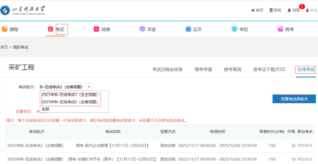 在移动APP首页上,点击“在线考试”,进入在线考试页面:在该页面点击批次,在批次下拉列表中会显示“2025年秋-在线考试1(含主观题)”和“2025年秋-在线考试2(全客观题)”,核实各批次下考试科目后,点击开始答题,即可参加线上考试。