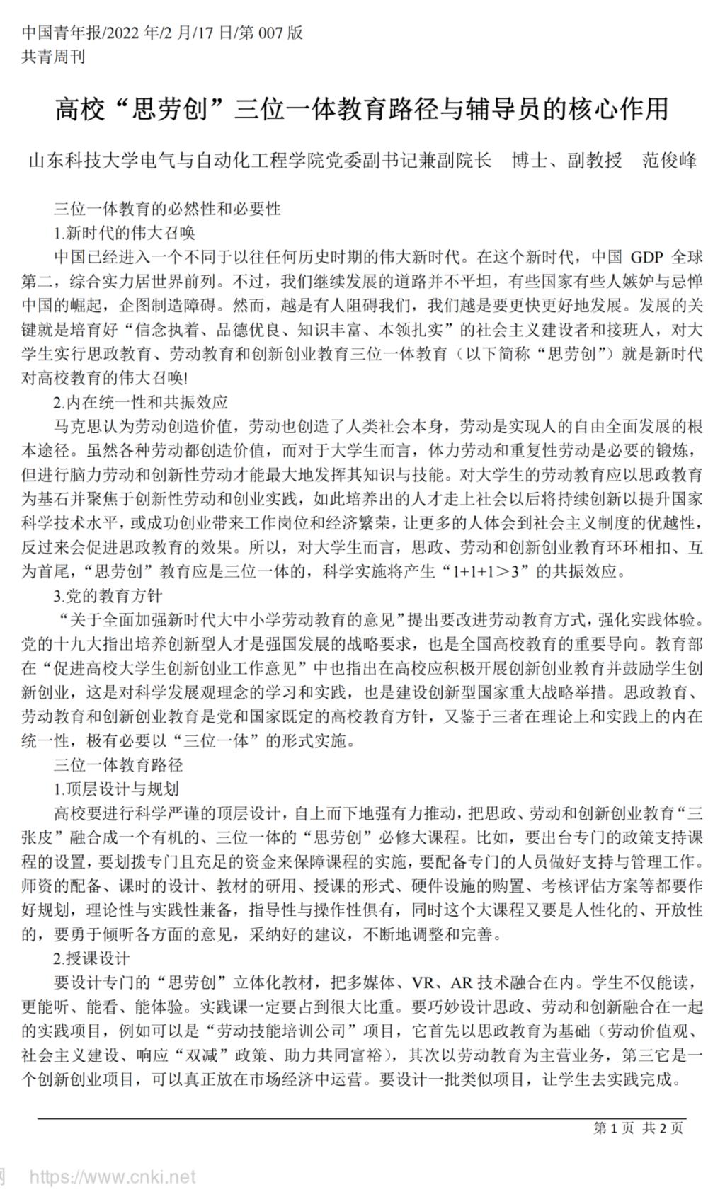 6 高校“思劳创”三位一体教育路径与辅导员的核心作用